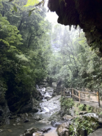 黑山谷的森林覆盖率达97%,是目前重庆地区最大的、原始生态保护最完好的自然生态风景区。 导游说走完这六公里的路,需要过六个吊桥。我们一边数着经过的桥,一边看着脚下的流水,四周是青山作伴,好不惬意。时不时还能抬头望望从山顶泻下的瀑布,只不过季节的原因,瀑布都变成“涓涓流水”了。