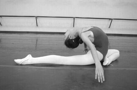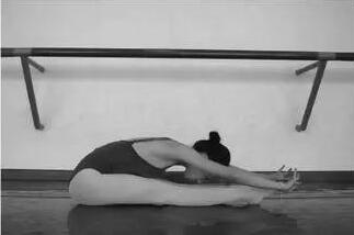 腿是以坐姿为基本姿态,前腿绷脚吸腿,后腿在外开、绷直的形态上向后向远拉伸。