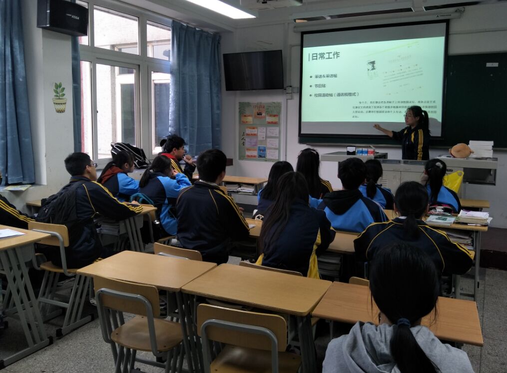 第二阶段,日常工作培训。副部长吴钟琪利用ppt简单阐述了,记者部的日常生活、成员种类、活动方式,让成员更加清晰的了解记者部的多样性和创新性。