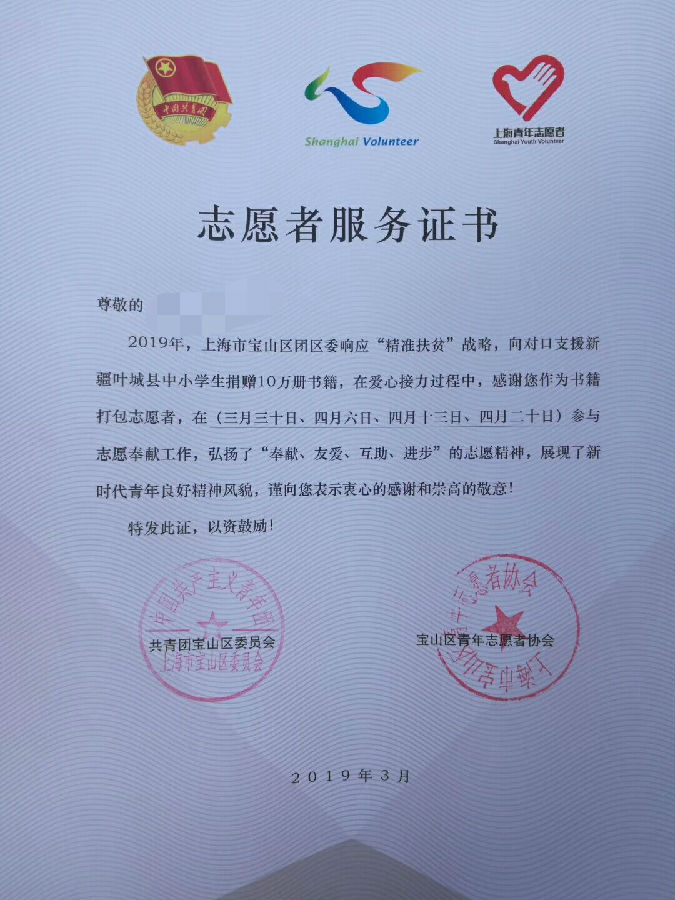 2019年,上海市宝山区团区委响应“精准扶贫”战略,向对口支援新疆叶城县中小学生捐赠10万册书籍。来自新闻职校、宝山消防、宝山民革、上海大学、宝冶建工、宝武环科、工商银行、税务分局、吴淞科技园等各组织的青年志愿者都积极响应,助力本次援疆志愿者活动。我校14名学子参与其中,为援疆志愿贡献自己的一份力量。