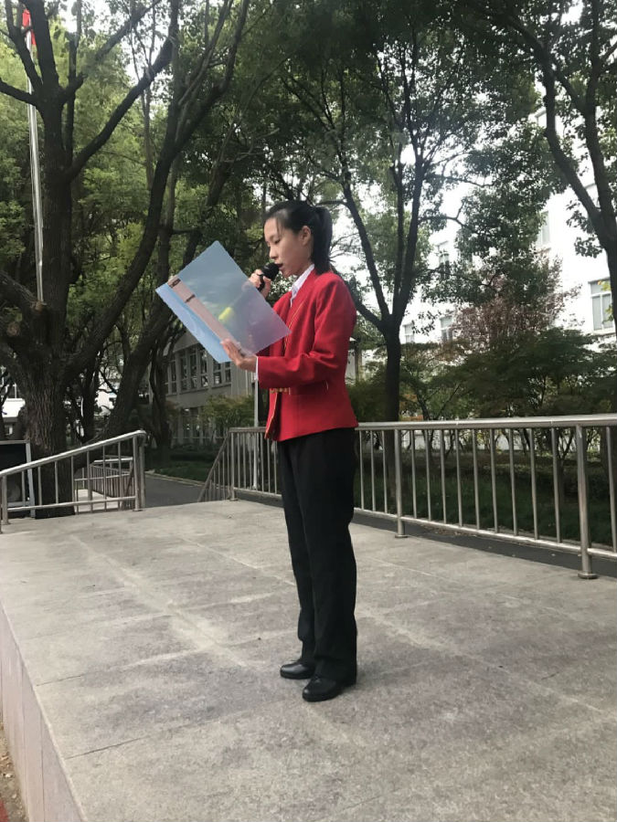 尊敬的各位老师,亲爱的同学们,大家早上好!我是17级艺术与科技中本贯通班的宋紫萱,很荣幸今天的升旗仪式由我来主持。