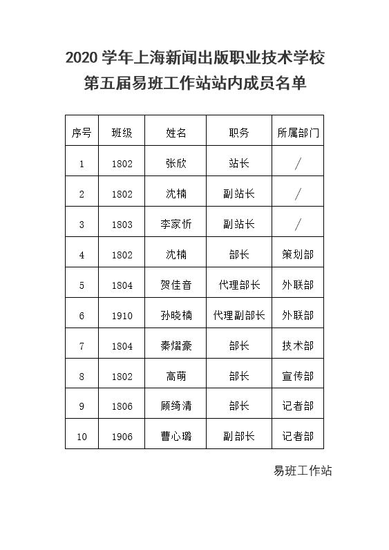 第五届易班工作站站内成员名单