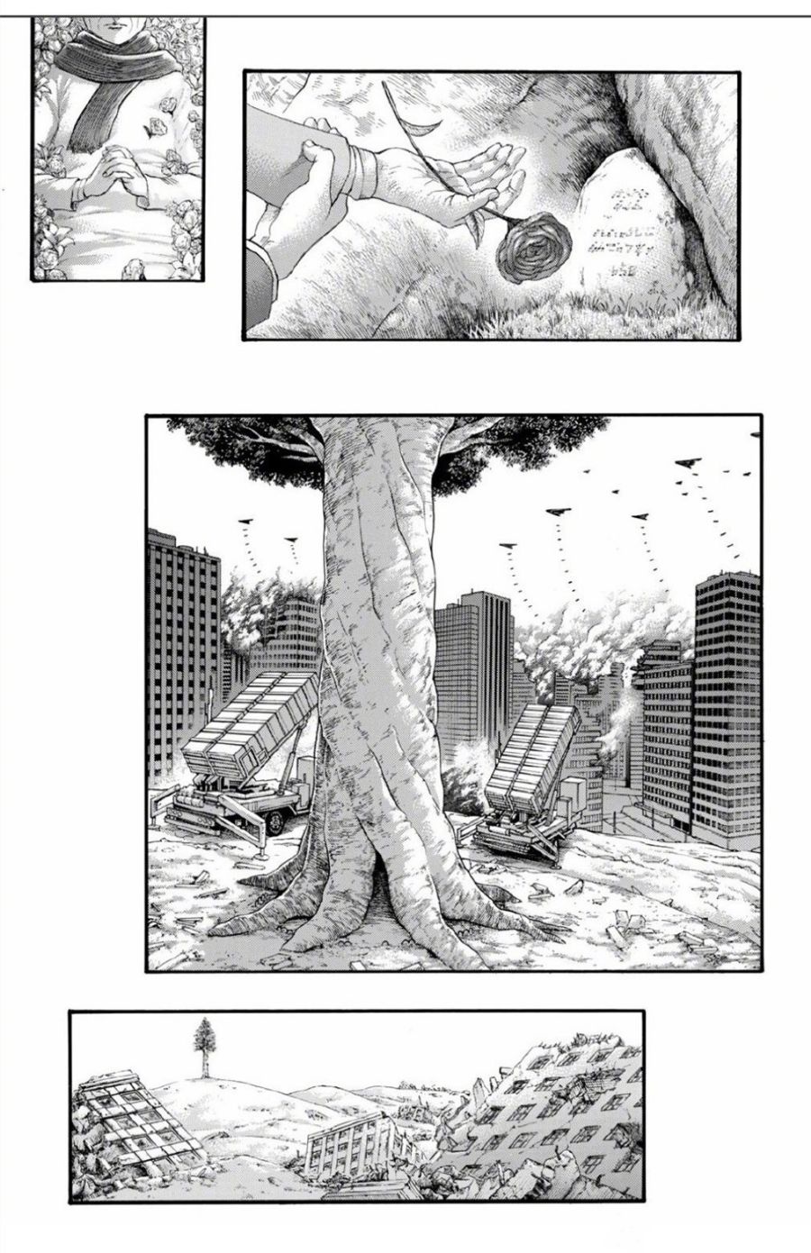 三笠死后又过了最少几百年时间,帕岛已经遍布高楼大厦,同时遭到空袭,在大树边还有现代的防空武器。最终帕岛被战争摧毁,大楼纷纷倒塌,只剩下远处的树依然挺立。看来帕岛还是没能摆脱战争的命运,只不过延迟了很长时间而已。