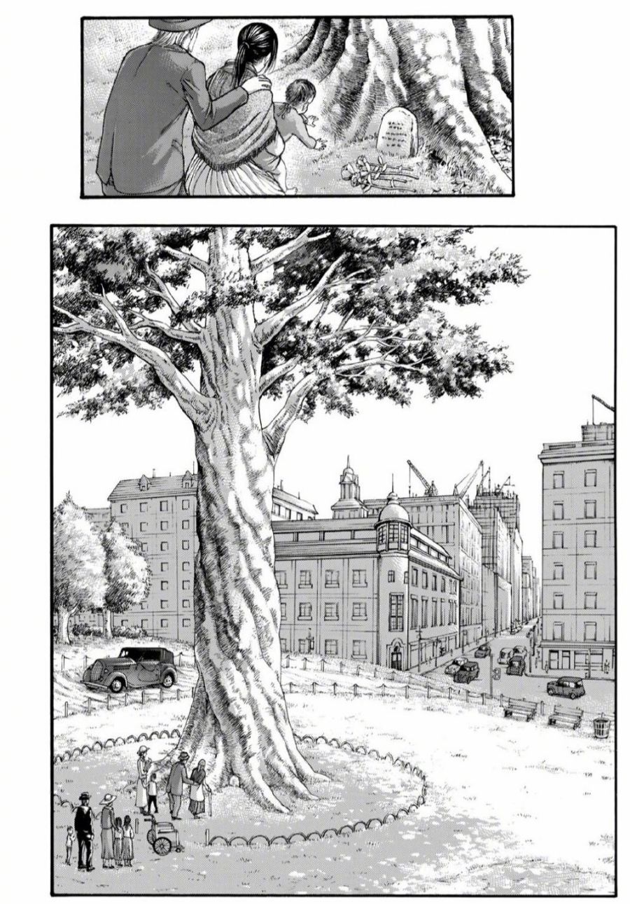 三笠结婚之后给艾伦扫墓,从第一个图上就能看出来,三笠已经和其他人结婚,并且有了孩子,脖子上依然戴着艾伦给的围巾。三笠到了老年之后依然带着全家人来给艾伦扫墓,这个时候的帕岛已经进入了高楼林立的建造阶段,说明在三笠有生之年帕岛还是比较和平的。至于和三笠结婚的人是不是让,这就很难说了,单从背影来看分辨不出来。