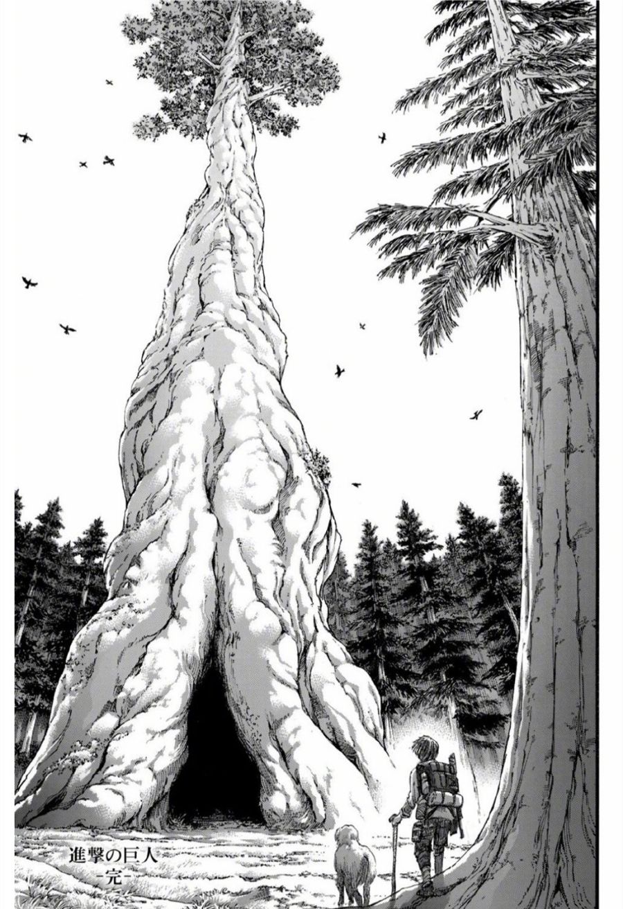 男孩进入树中,巨人之力将得到延续.从倒下的大楼开始生长植物来看,成为废墟的帕岛又经历了很长时间,一个背着枪和行李的少年带着一条狗来到了埋着艾伦的树前。这个镜头显然对应着最初尤弥尔获得巨人之力的时候,可以对比前几幅图,艾伦的墓碑已经逐渐被树吞没了进去,留下了一个树洞引诱着人进去。可以想象这个少年进去之后同样得到了巨人的力量,然后为了拯救帕岛让巨人再次现身,由他当主角的巨人故事将会延续下去。