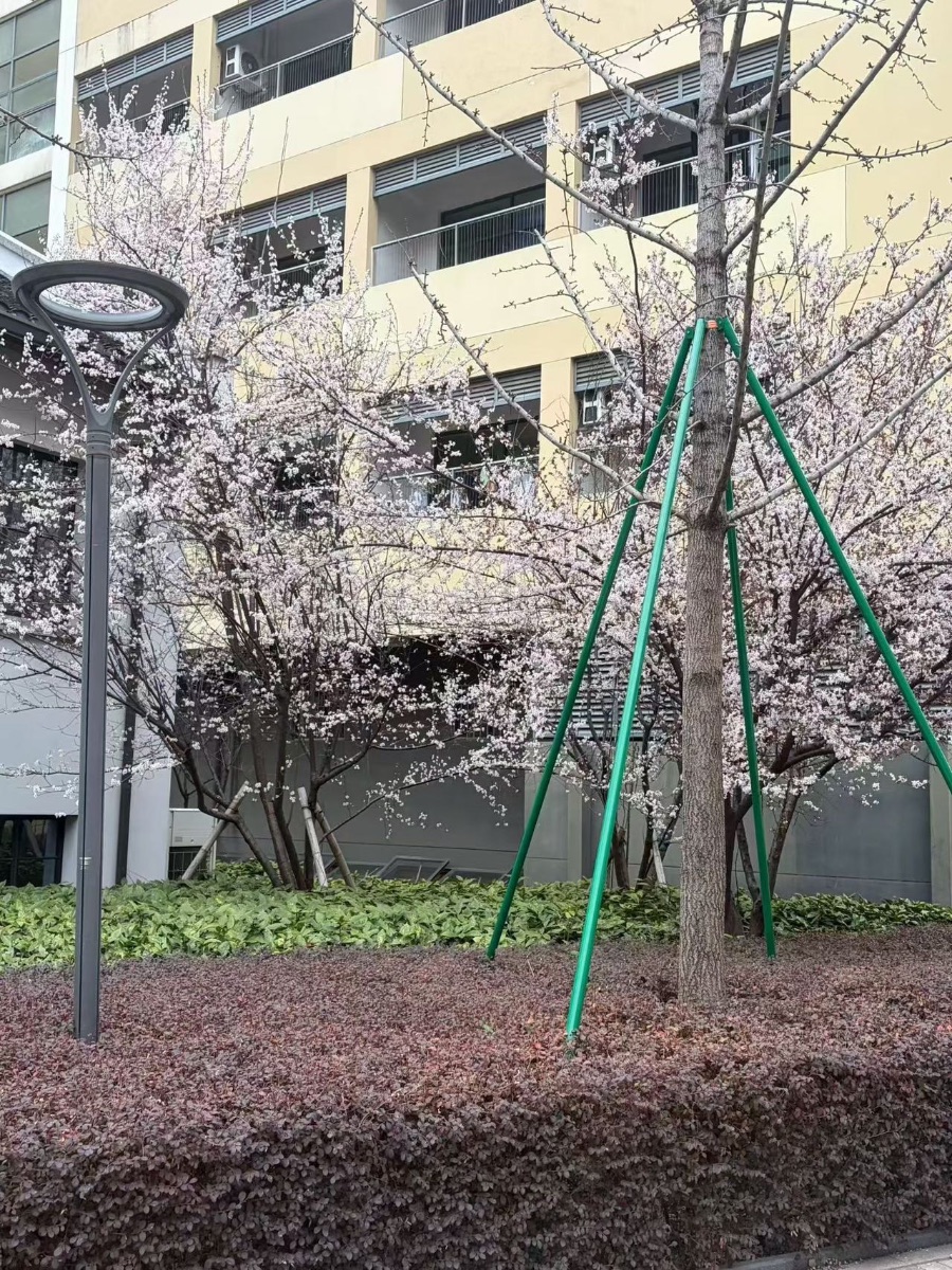 几株树木被翠绿的支撑架稳稳托住,下方是深褐与嫩绿交织的灌木丛,层次分明。一旁的灰色路灯静静伫立,将现代建筑的规整与自然的烂漫巧妙融合。风掠过花枝,细碎的花瓣簌簌落下,仿佛把整个春天的温柔都揉进了这一方小小的天地里。