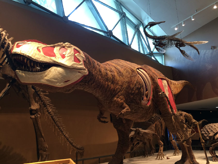 了解了“生命”,那么生命的演化是如何的呢?答案在地下一层的“演化之道”展厅中,演化是生命世界永恒的主题,从单细胞生物到多细胞生物,再到种类纷繁的动植物,生命从低级走向高级,遍布海洋和陆地。展厅中的“霸王龙”吸引了无数游客的目光,大家都驻足而观,纷纷拿起相机或手机对着它“咔嚓咔嚓”两声,也算是见过“霸王龙”了。